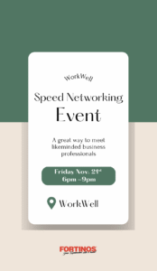 We are so o excited for our upcoming Speed Networking event held here at WorkWell Spaces! November 21st, 901 Guelph Line from 6-9 pm – bring your business cards and your authentic selves! Catering by Fortinos! A chance to eat some delicious food and meet likeminded people in a business casual setting.